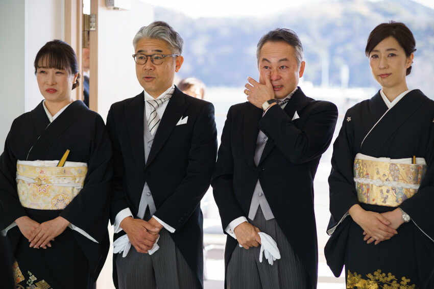 神聖な白いチャペルの中、これまでのおふたりとの人生を振り返り涙があふれるご両親。